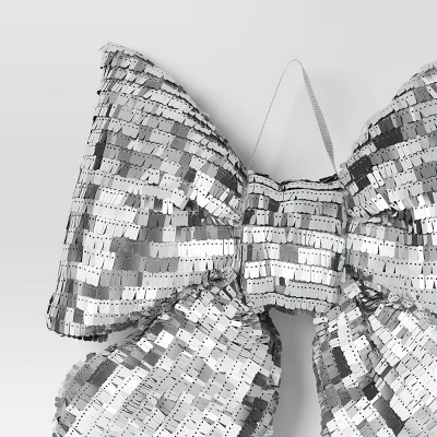 Add a little extra touch to your holiday tree with this Christmas Jumbo Cable Knit Bow Wall Decor from Wondershop™. The Christmas jumbo wall decor features a cable knit bow with allover silver disco detailing for a delightful style that’s sure to spruce up your holiday decor. Plus, the silver ribbon loop on top allows for easy hanging. Hang them on an entryway wall, mantel or anywhere else you want a bit of festive flair.