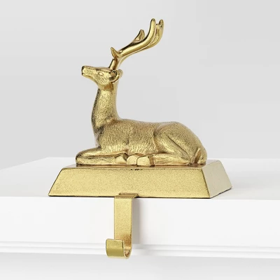 Bring a refined touch to your holiday decor with this 2-Pack Christmas Deer Stocking Holder Set from Wondershop™. This set includes two stocking holders — one in standing position and another in sitting a position — creating an inviting ambiance. Made of resin, these stocking holders are designed in gold-tone hue for a luxurious charm. The deer rest on a rectangular base with hooks to display your favorite stockings on Christmas Eve.
