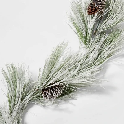 Put the perfect finishing touch on your holiday decor with this 9′ Pre-Lit Battery-Operated Flocked Long Needle Artificial Pine Christmas Garland from Wondershop™. Designed with faux flocked long pine needles, pinecones and white LED lights, this 9-feet artificial garland will fill any indoor or sheltered outdoor space with a warm glow. Simply hang it from any wall or door and watch it light up with the help of 2 AA alkaline batteries (not included).