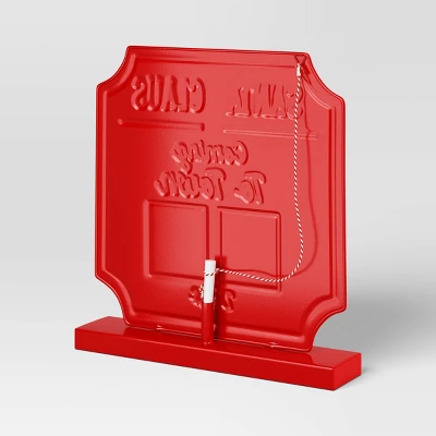 Keep the anticipation of the festive season alive with this Christmas Countdown Sign from Wondershop™. Made of metal, this countdown sign features a square frame with curved corners and showcases the message “Santa Claus is coming to town” on a red backdrop with snowflake details. Two small blackboard surfaces and the attached chalk on a string allow you to easily change the date each day until Christmas. Boasting a rectangular base, this countdown sign is ideal for placing on tabletop or above the mantel.