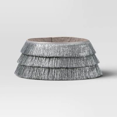Bring a touch of magic to your tree base with this Tinsel Tree Collar from Wondershop™. Crafted with shiny solid-color tinsel, this tree collar features a layered fringe design for an eye-catching look, effortlessly blending sophistication with seasonal warmth. Plus, it boasts a convenient roll-up design for easy storage when not in use.